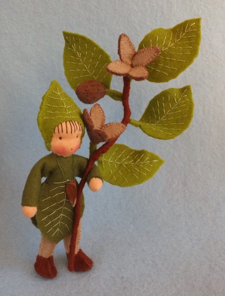 Met prachtig felgroen blad waar je goed de nerven op kunt zien. En natuurlijk de beukennootjes waarbij hij een echt beukennootje als ketting draagt. De hoogte van de pop met tak is 18cm.