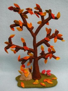 De boom heeft prachtige herfstbladeren van wolvilt. Er onder staat een bladerenmand van jute en groeien paddenstoelen. Met kleine aanpassingen is deze boom om te toveren in een winter, lente en zomerboom. De boom is 21cm hoog en een echte aanwinst voor de herfsttafel.