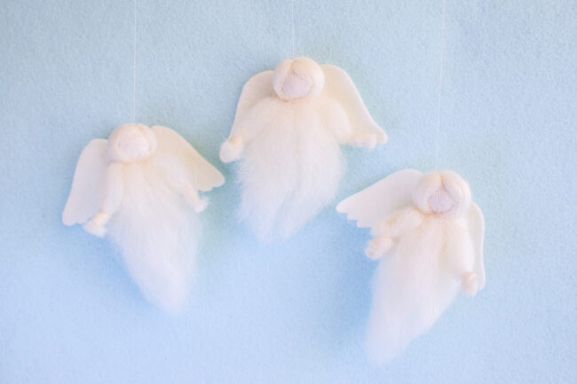 Deze engelen hebben een etherische uitstraling en zijn gemaakt van tricot en lontwol. Ze zijn ongeveer 10 cm. Met restjes wol kun je nog veel meer maken voor in je kerstboom of om weg te geven.