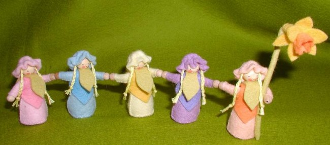 Textiel en Handwerken - DIY Poppen en Knuffels ‐Pakketten <naar overzicht> Viltpakket Pippilotta Lente Optocht Atelier Pippilotta Viltpakket Lente OptochtVijf kinderen vieren de lente met een optocht. Het voorste kindje houdt een narcis vast. De kinderen zijn zes cm en gemaakt van negen kleuren vilt.