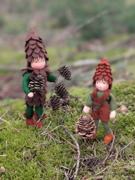 Twee kinderen van ca.16 en 12cm groot, betoverend mooi met hun dennenappelmutsjes en warme kleding.