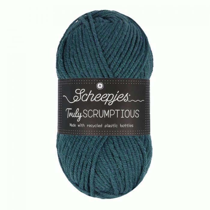 Scheepjes Truly Scrumptious is een Premium Acrylgaren gemaakt van 50% Gerecycled Polyester (plastic flessen) en 50% Acryl. De geadviseerde naalddikte is 5.00mm (stekenverhouding: 13 steken x 18 naalden tricotsteek is 10 x 10cm). Verkrijgbaar in 80 kleuren, in bollen van 100 gram (looplengte 108 meter).